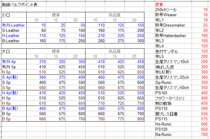 出雲ニューマジンシア通信Ultima Online IZUMO - - - New Magincia Governor's BlogPAGE | 444 445 440 443 442 212 441 437 439 438 432 | ADMIN | WRITE 2020.07.18 Sat 17:53:47 新バルクシステムポイント表(2020.7.18修正)自分用メモとして作った雑な表ですが、ご参考までに掲載いたします。