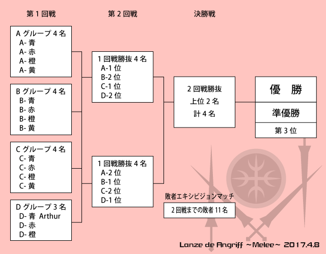 ・第1回戦の組合せは、当日受付時のくじ引きで決まります。 ・第1回戦Dグループのみ、3名での打ち合いとなります。 勝ち抜けるのは他グループと同じく2名で、 順位ポイントは「1位2pt、2位1pt、3位0pt」となります。 初撃ポイントは1ptで加算されます。 また相打ちが生じた場合は次の通りとなります。 ☆2人残った状態で相打ち→双方2位とみなし1ptずつ ☆3人の状態で2人が相打ち →落ちた2人は初撃ボーナス1ptずつ得るが、順位ptはなし 生き残りは1位として2pt ・上記3名のDグループに、当方主催の過去大会で最も好成績の Arthur様(優勝2回、準優勝1回)が入ります。 ・敗者復活戦はありません。 但し2回戦までの敗者11名でエキシビジョンマッチを行います。 勝者にはAlcionからささやかなプレゼントをいたします。 ※※※※※ 関連情報 ※※※※※ ★ 開催概要 ★ ルール・注意事項 ★ 選手のエントリー方法 ★ 選手名簿(最終リスト) . . . CommentsComment Form |