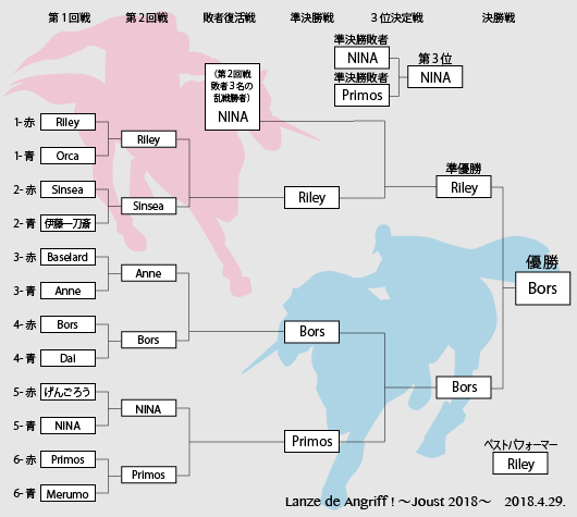 結果速報をお届けいたします! ※画像クリックで拡大します 優勝 Bors 様 準優勝/ベストパフォーマー Riley 様 第3位 NINA 様 今回も手に汗握る熱戦が続き、 また各騎士のパフォーマンスも非常に個性的で魅力溢れており、 一瞬たりとも目の離せないような、すばらしい大会になりました。 ご参加・ご来場いただきました全ての皆様に、心より感謝申し上げます! 大会の様子は動画として公開いたします。 今回も昨年同様、1か月以内を目標に完成させます!(が、がんばる……!) どうぞお楽しみに! ※※※※※ 関連情報 ※※※※※ ★ 開催概要 ★ ルール・注意事項 ★ 選手のエントリー方法 ★ 選手名簿(最終リスト) . . 2018.04.28 Sat 20:16:06 18.4.29 馬上槍試合(個人戦) 選手名簿(最終リスト)2018/4/29(日)開催 馬上槍試合(個人戦)