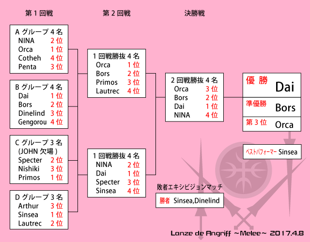 結果速報をお届けいたします! 4/18追記: ★決勝戦において、2合実施後のポイントを 「Dai様:6pt、Bors様・Orca様・NINA様:各3pt」と発表し、 3ptの3名で2位/3位決定戦を行い 「Bors様:2位、Orca様:3位、NINA様:4位」の結果となりました。 しかしながら、後日確認いたしましたところ、2合後のptは 「Dai様:6pt、Bors様・Orca様:各3pt、NINA様:2pt」が正しく、 本来ならBors様・Orca様の2名で決定戦を行うべきでした。 順位につきましては、Dai様:1位、NINA様:4位は2合後で定まっており、 決定戦でBors様がOrca様を落馬させて勝利している点をふまえ、 当日発表通りの 「Dai様:優勝、Bors様:準優勝、Orca様:第3位」で 確定させていただきます。 しかし、正しく決定戦を実施していれば結果が違っていた可能性も否定できず、 第3位のOrca様には準優勝相当の賞金をお贈りすることとし、 後日差額およびお詫びの品をお渡しさせていただきます。 皆様に多大なご迷惑をお掛けし、スタッフ一同心よりお詫び申し上げます。 今後チェック体制を十分にしてこのようなミスを起こさぬよう重々注意いたします。 出雲馬上槍試合を変わらずお楽しみくださいますよう、お願い申し上げます。 (→ 審判Rocchi様の該当記事) ※画像クリックで拡大します 優勝 Dai 様 準優勝 Bors 様 第3位 Orca 様 ベストパフォーマー Sinsea 様 乱戦形式は前首長の時代に一度開催されておりましたが、 私が主催のメインとなるのは始めてのことでした。 至らぬ点もありましたが、皆様にお楽しみいただけたなら幸いです。 私自身は、準備も当日も非常に楽しみました! ご参加・ご来場いただきました全ての方に、心より感謝申し上げます。 また試合の様子をAmenouzume様が早速ブログでご紹介下さいました。 どうもありがとうございます! → We all Love Yew 「第6回出雲馬上槍試合 2017年4月9日」 大会の様子は動画として公開いたします。 今回は1か月以内を目標に完成させます…!!(た、多分……) どうぞお楽しみに! ※※※※※ 関連情報 ※※※※※ ★ 開催概要 ★ ルール・注意事項 ★ 選手のエントリー方法 ★ 選手名簿(最終リスト) ★ トーナメント表 . . |