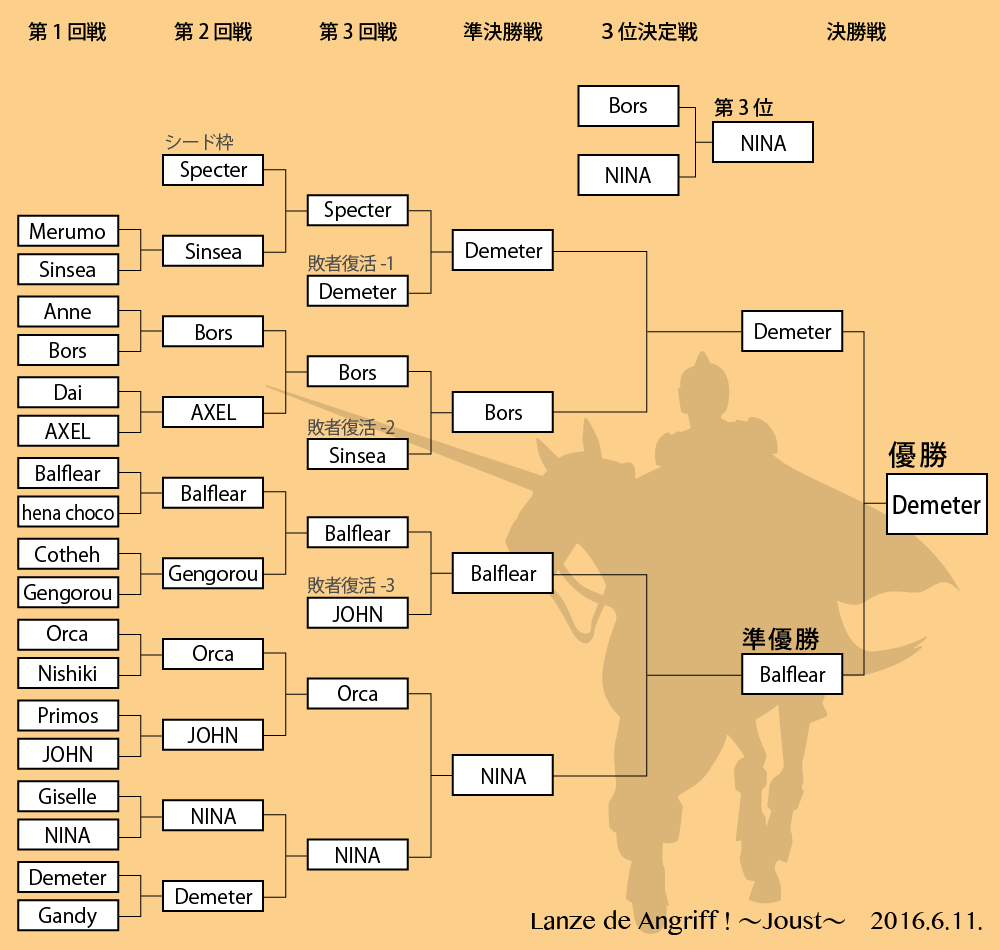 騎士団長・Giselle様がしばらくのあいだ修行の旅へ出られ、 僭越ながら私が団長代行を務めることになったためです。 ちょうどその日、第9期New Magincia首長に就任も叶い、 Giselle様にこれまで通りの称号「Ritter Des Herbstes(秋の騎士)」を お贈りいたしました。 旅の幸運をお祈りしながら、ご帰還をお待ちいたします。 Giselle様の出立をお見送りした後、数人でのんびりおしゃべりを。 (槍試合反省会の予定でしたが、来月の市民集会に改めて行います。) 深夜頃には準優勝のBalflear様も立ち寄って下さいました。 「団体戦もいいけど、個人戦は個々のRPが際立って面白い」とのご意見、 自分も深くそう感じました。 第9期は、どなたもお気軽に参加できるミニイベントを こまめに開催したいと考えております。 また、戦闘が大の苦手なこの騎士団長代行を、 厳しく鍛えていただけたらと思います……! 今期もなにとぞよろしくお願い申し上げます。 . . 2016.06.12 Sun 11:53:58 16.6.11 馬上槍試合・結果速報 |