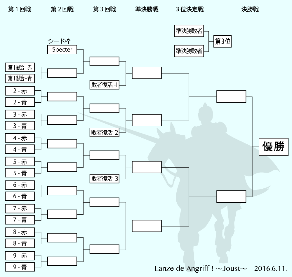 ・第1回戦の組合せは、当日受付時のくじ引きで決まります。 ・選手が奇数だったため、今回の参加者中、当団体主催の過去大会で 最も好成績のSpecter様(優勝2回、第3位1回)がシード枠に入ります。 ・トーナメントの調整上、第3回戦で3名が敗者復活枠に入ります。 選出方法は、「それまでの獲得ポイントが高い順」→ 「同点ならば落馬数が少ない順」→ 「更に同点ならばサドンデスで打ち合い」となります。 ・イベント時間がかなり長くなることが予想されますので、 第3回戦までは、打ち合いの回数を基本7回までとします。 7回激突後にポイントがリードしている選手の勝利とし、 同点だった場合はサドンデスに移行します。 ・準決勝以降は、告知ルール通り2ポイント先取で勝利となり、 打ち合い回数の制限はありません。 ※※※※※ 関連情報 ※※※※※ ★ 開催概要 ★ ルール・注意事項 ★ 選手のエントリー方法 ★ 選手名簿(最終リスト) . . . 2016.06.11 Sat 12:03:28 16.6.11 馬上槍試合 ルール・注意事項2016/6/11(土)開催 馬上槍試合個人戦「Lanze de Angriff ! ~Joust~」の ルールや注意事項に関する情報です。 ※ 6/11 12時 追記しました。 . . 2016.06.11 Sat 02:45:12 16.6.11 馬上槍試合 選手名簿(最終リスト)2016/6/11(土)開催 馬上槍試合個人戦「Lanze de Angriff ! ~Joust~」の