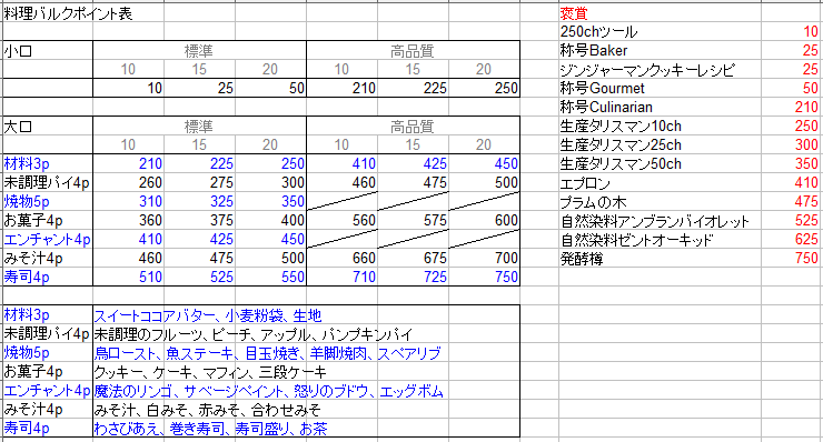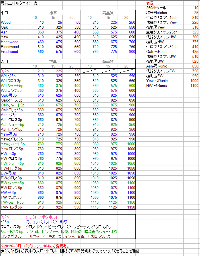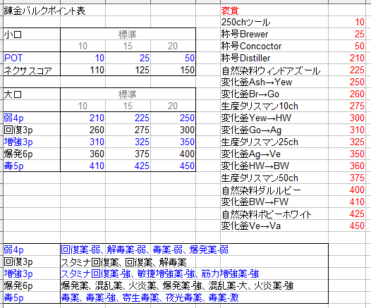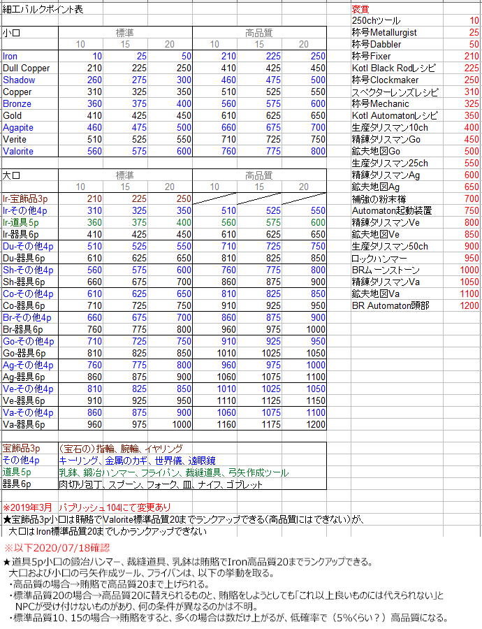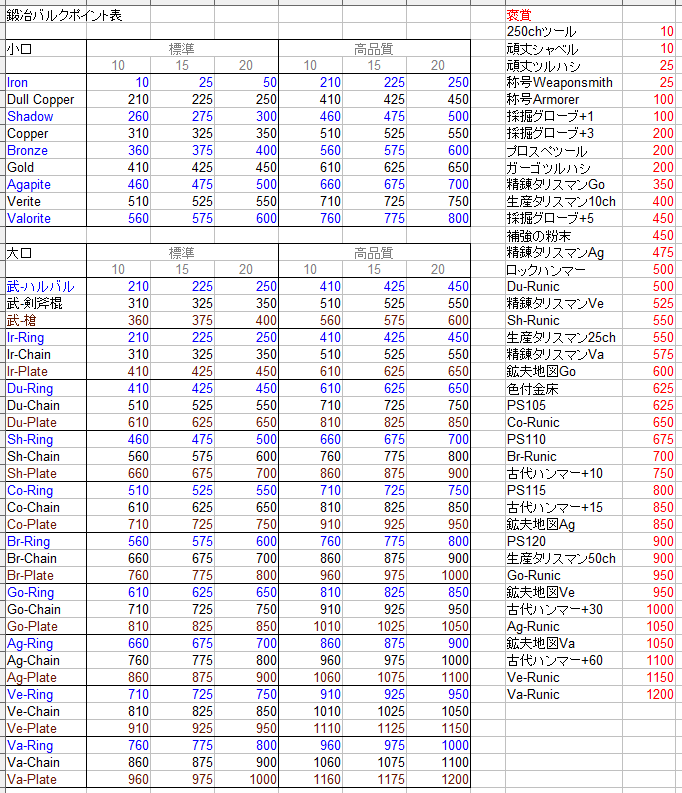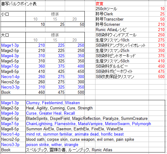 出雲ニューマジンシア通信Ultima Online IZUMO - - - New Magincia Governor's BlogPAGE | 444 445 440 443 442 212 441 437 439 438 432 | ADMIN | WRITE 2020.07.18 Sat 17:53:47 新バルクシステムポイント表(2020.7.18修正)自分用メモとして作った雑な表ですが、ご参考までに掲載いたします。