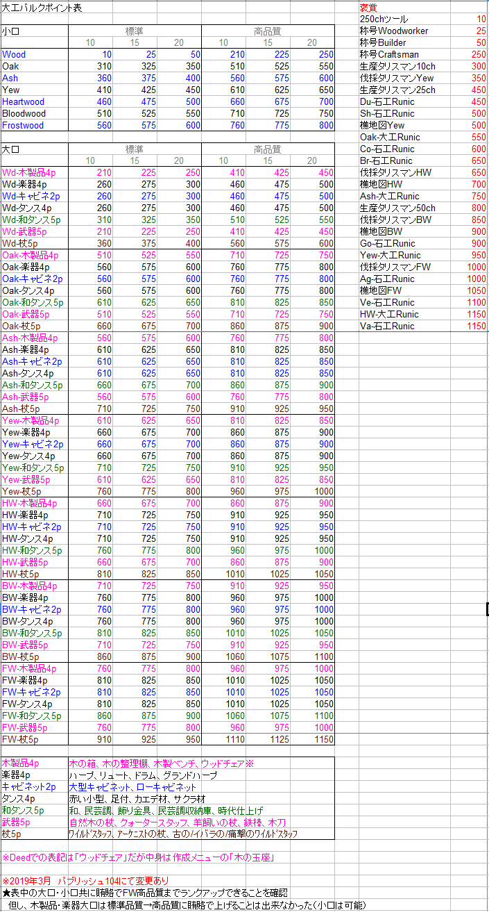 画像クリックで原寸サイズが見られます。 全てのDeed現物を調べたわけではなく、推測して補完した部分も多いので 間違いがあればご容赦下さい。 その際はコメントでお知らせいただければ助かります。 ★2020/7/18更新 混迷を極める細工バルク道具5pについて、先ほど再確認をしてみたのですが…… <大口、小口フライパン、小口弓矢作成ツールは NQ20→HQ20の賄賂ができるものとできないものがある> ということが判明しました。 も、もうなにがなんだか訳が分からない! バルクの入手時期によるのかもしれません… もう下の結論でまとめときます;;トホホ… 「化けるかわからないけどとにかく賄賂してみてください」 (過去経緯) 2019/12/28: 細工道具5p大口について、NQ20→HQ20の賄賂ができることを確認。 しかし、小口フライパンおよび弓矢作成ツールはできないままで、 下の通りの挙動でした。 (相変わらずのUOクオリティだなあ…;;) ★道具5p小口の鍛冶ハンマー、裁縫道具、乳鉢および大口は 賄賂でIron高品質20までランクアップできる。 小口の弓矢作成ツール、フライパンは、以下の挙動を取る。 ・高品質の場合→賄賂で高品質20まで上げられる。 ・標準品質20の場合 →賄賂をしようとしても 「これ以上良いものには代えられない」とNPCが受け付けない。 ・標準品質10、15の場合 →賄賂をすると、多くの場合は数だけ上がるが、稀に高品質になる。 (確率は5~10%くらい?サンプリング数が少ないので明確ではないが、 27枚のNQ10大口に賄賂をして2枚だけがHQ10に、残りはNQ15になった。) 2019/10/1: フライパンに加え、弓矢作成ツールも、 NQ20→HQ20の賄賂が効かない不具合ありでした。 鍛冶ハンマー、裁縫道具、乳鉢については、 NQ20→HQ20の賄賂ができることを再確認いたしました。 9/30: 細工の道具5pで妙な挙動を発見したので修正。 表の画像にも記載しましたが、内容は次の通りです。 (まあ…設定ミスなのでしょうけど;;) 7/4: 細工の道具5p大口で高品質がもらえることを確認したので修正。 しかし標準→高には賄賂で上げられませんでした。 ★2019/6/23更新 2019年3月導入Pub104にて、細工/大工/弓矢工バルクの修正あり。 遅くなりましたが対応版に差し替えました。 詳細は続きの下表をご覧ください。 (でもイマイチすっきりしてないのですよね~~;) ※画像が多いため、折りたたみます※ . . Comments凄くわかりやすい!Posted by 霜パラリ 2017/01/15(Sun) 01:44:58 EDIT はじめまして、IZMではプレイしてませんが、弓矢工で樵地図FWを貰う時には注意します。